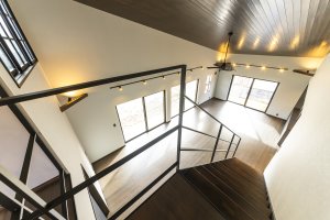 2階まで続く勾配天井の心身ともにゆとりを感じられる空間