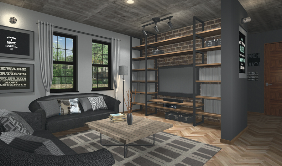 シェルフには、お気に入りの音楽CDやDVD、その他こだわりのLPや本などがたっぷりと仕舞え、